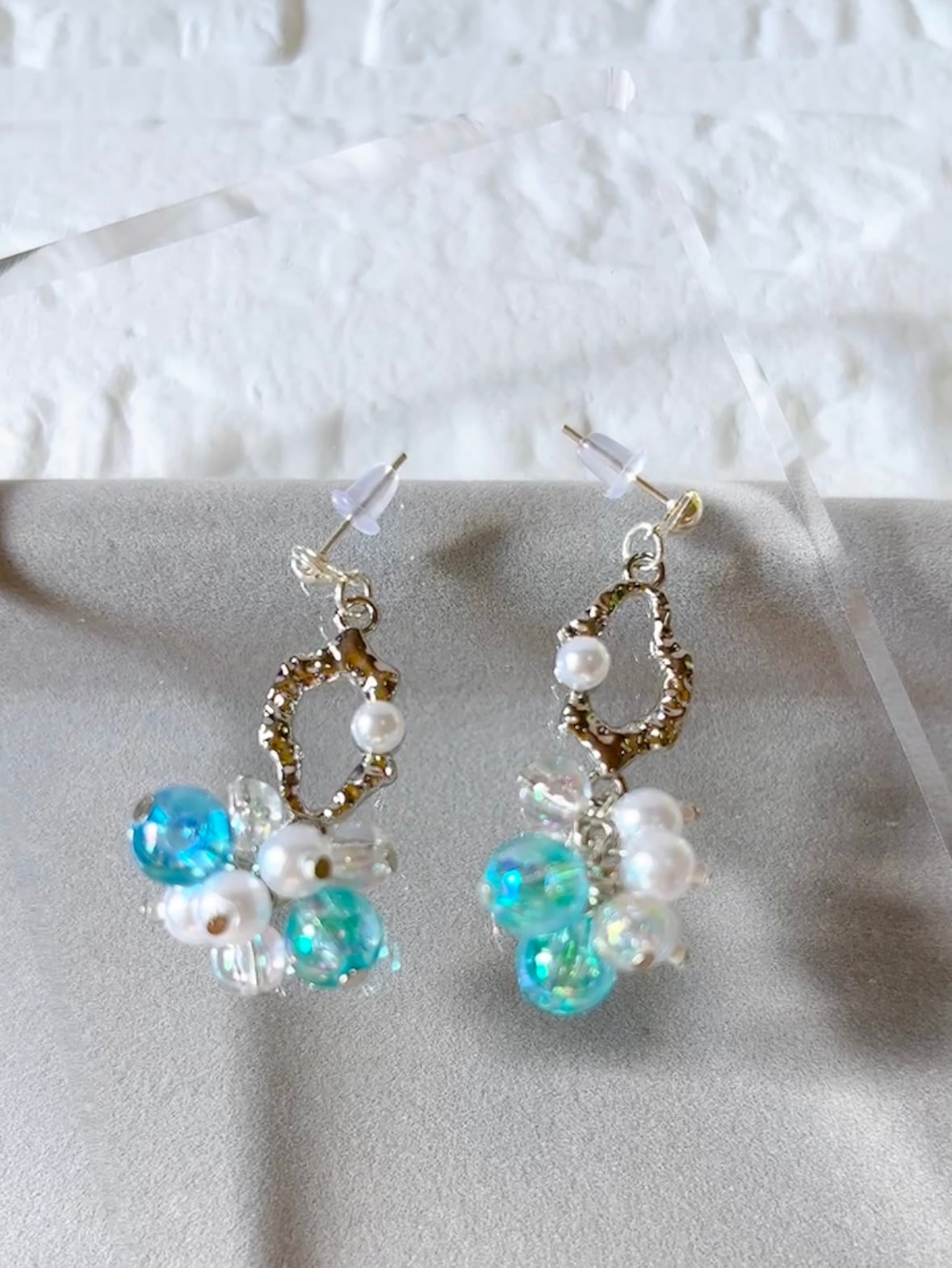 オーロラブルー×パールビーズのさわやかピアス No.46