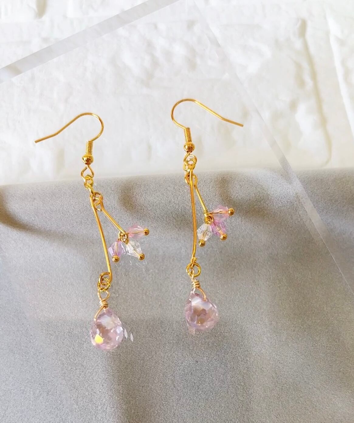 淡いピンクが上品に揺れる|華奢ライン×クリスタルの大人フェミニンピアス No.69